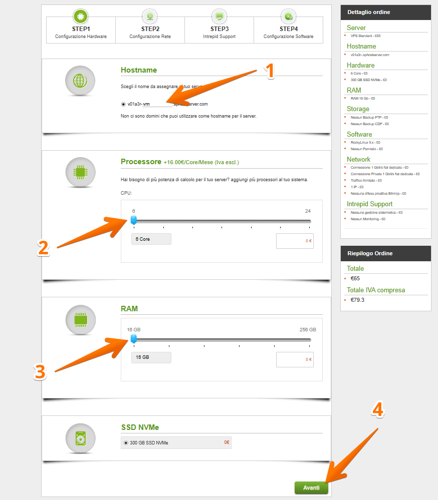 *il costo visualizzato in questa fase fa riferimento alle sole risorse hardware, per visualizzare il canone finale del VPS Hosting è necessario completare la configurazione.