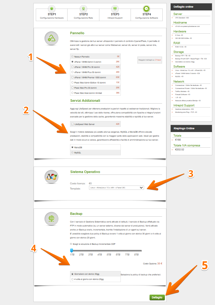 Scegliendo il servizio Intrepidsupport è necessario configurare il VPS Hosting con un pannello di controllo e un sistema di backup nello step successivo.