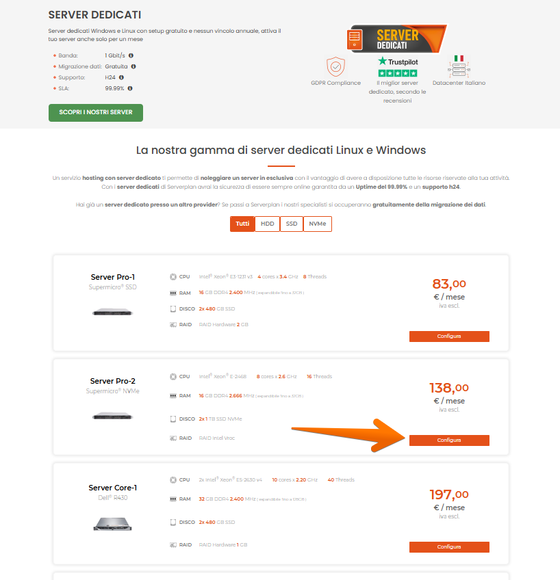 Puoi procedere all'acquisto di un Server Dedicato dal seguente link: https://www.serverplan.com/server-dedicati/