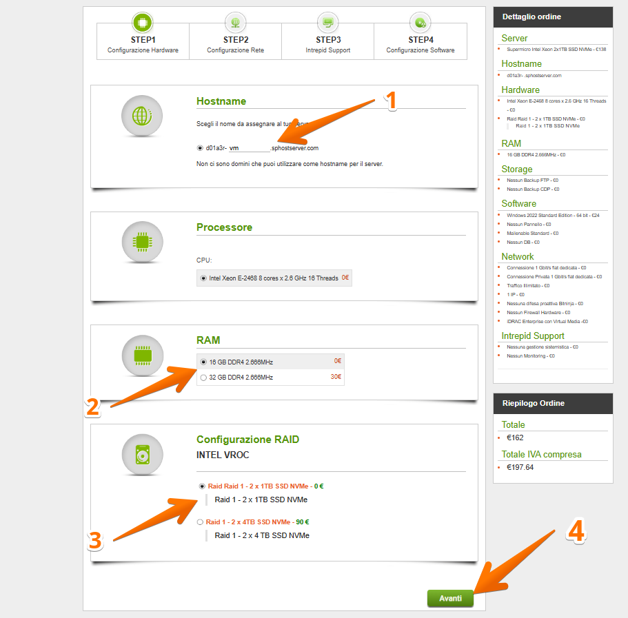 *il costo visualizzato in questa fase fa riferimento al solo noleggio del server (risorse hardware) per visualizzare il canone finale del server è necessario completare la configurazione.