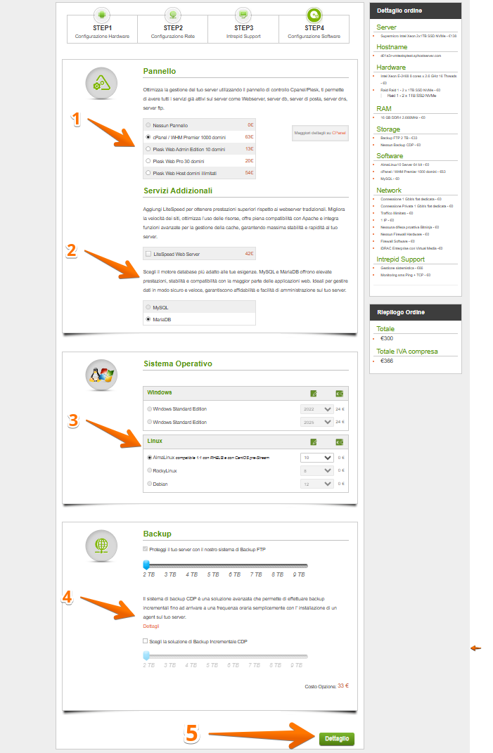 Scegliendo il servizio Intrepidsupport è necessario configurare il server con un pannello di controllo e un sistema di backup nello step successivo.