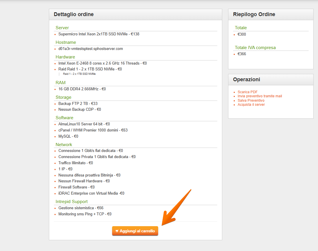 In questa schermata potrai visualizzare i dettagli della configurazione, per andare avanti clicca sul tasto arancione “Aggiungi al carrello” che trovi in fondo alla pagina.